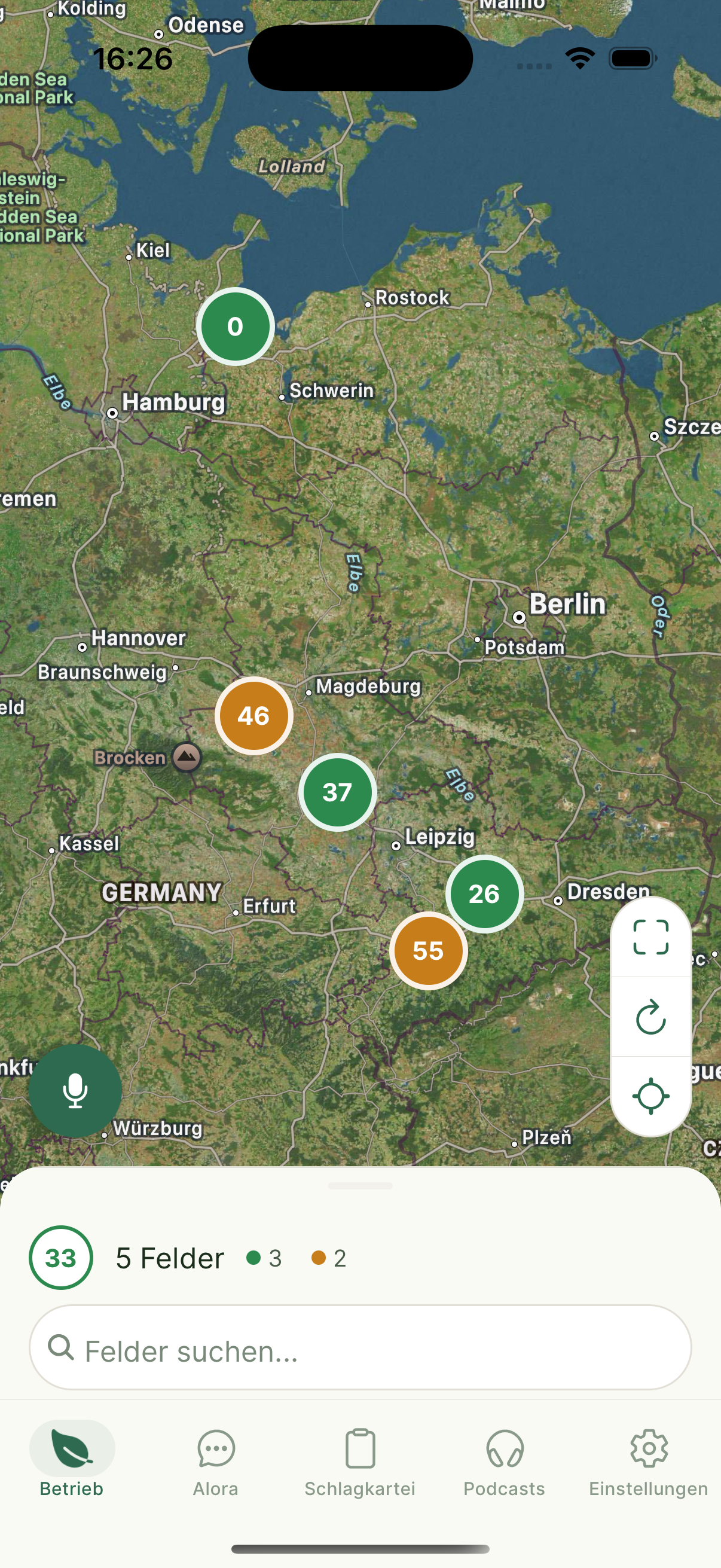 Applikationskarten für Ihren Düngerstreuer, tägliche Risikowarnungen, Dokumentation für Auflagen. Plus: morgendliches Audio-Briefing von Alora auf der Fahrt zum Schlag.
